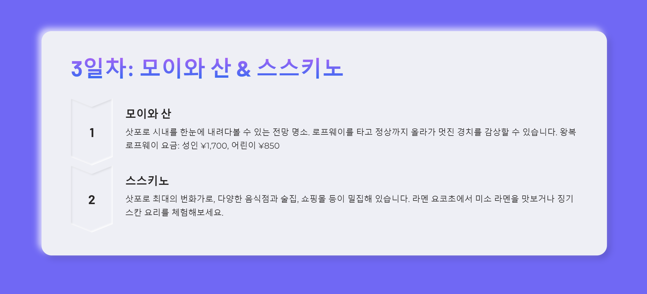 3일 차: 모이와 산 정상에서 아름다운 야경을 감상하고, 스스키노 지역에서 밤의 활기를 느껴봅니다.