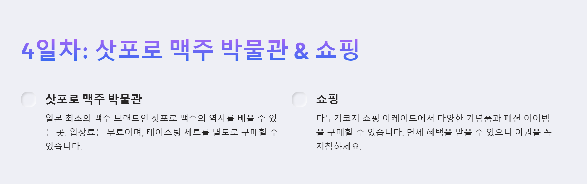 4일 차: 삿포로 맥주 박물관에서 일본 맥주의 역사를 배우고, 쇼핑을 즐기며 여행을 마무리합니다.