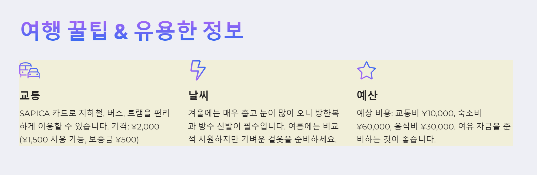 | 계절 | 날씨 | 추천 활동 | 주의사항 |