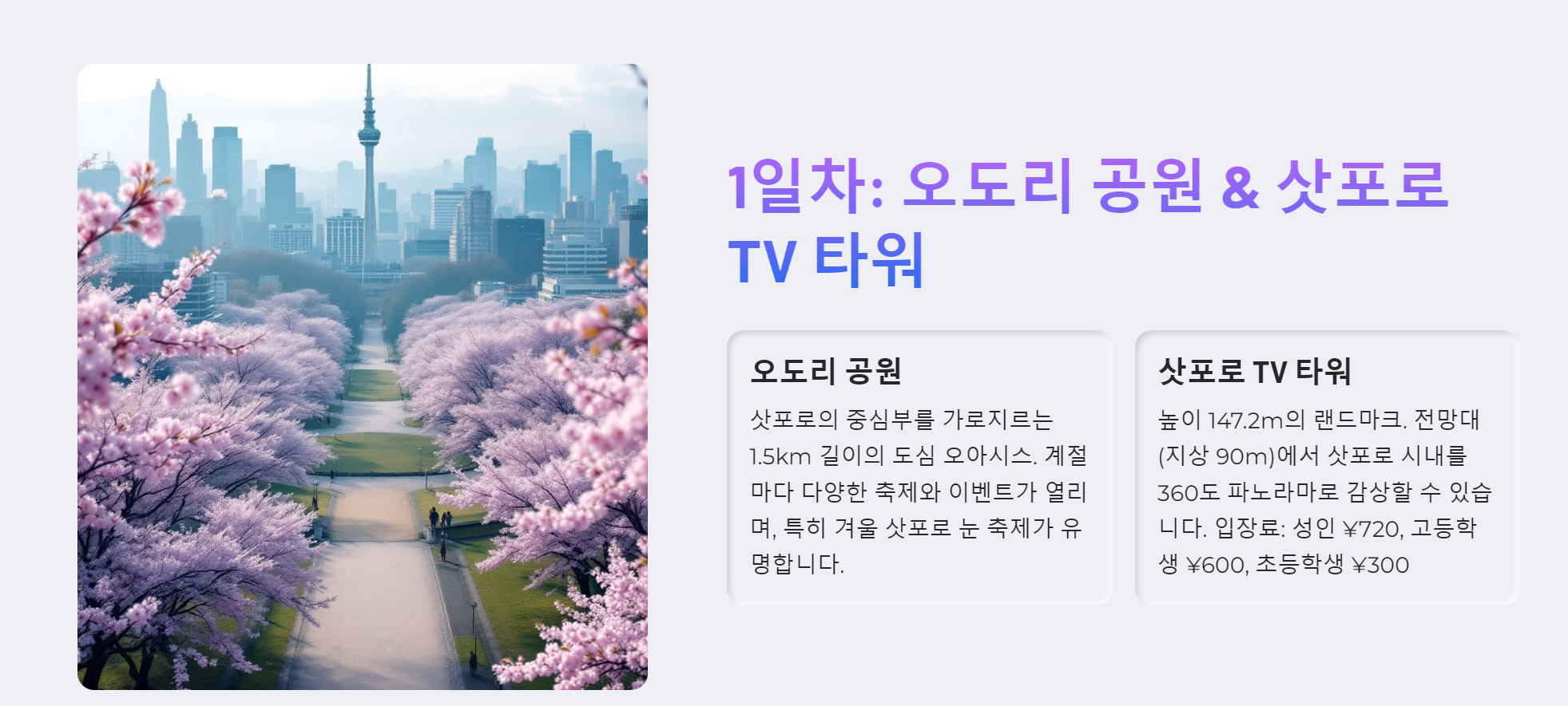 삿포로에서의 여행은 여러분께 새로운 경험과 즐거움을 선사할 것입니다. 그럼 이제 함께 떠나볼까요?
