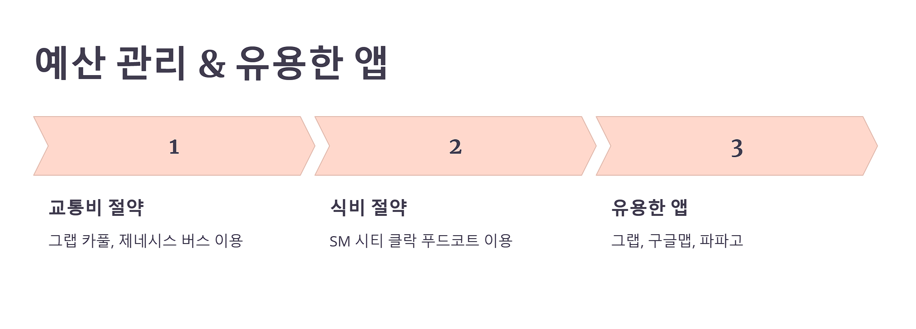 그랩 카풀 서비스를 이용하면 일반 택시보다 저렴해요. 장거리 이동시에는 제네시스 버스가 가장 경제적이에요.