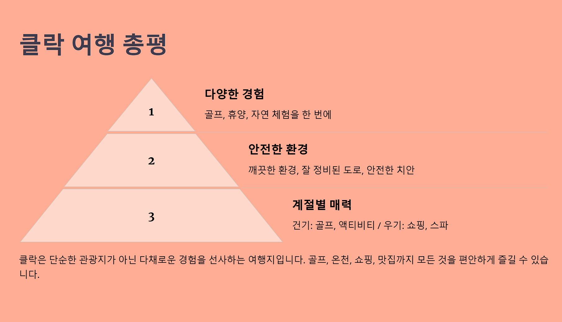클락은 단순한 관광지가 아닌 다채로운 경험을 선사하는 여행지예요. 골프, 온천, 쇼핑, 맛집까지 모든 것을 편안하게 즐길 수 있답니다.