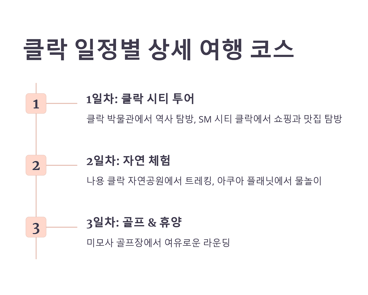 클락은 골프와 휴양, 자연 체험까지 다양한 경험을 한 번에 즐길 수 있는 매력적인 도시예요. 특히 깨끗한 환경과 잘 정비된 도로, 안전한 치안은 여행의 큰 장점이랍니다.