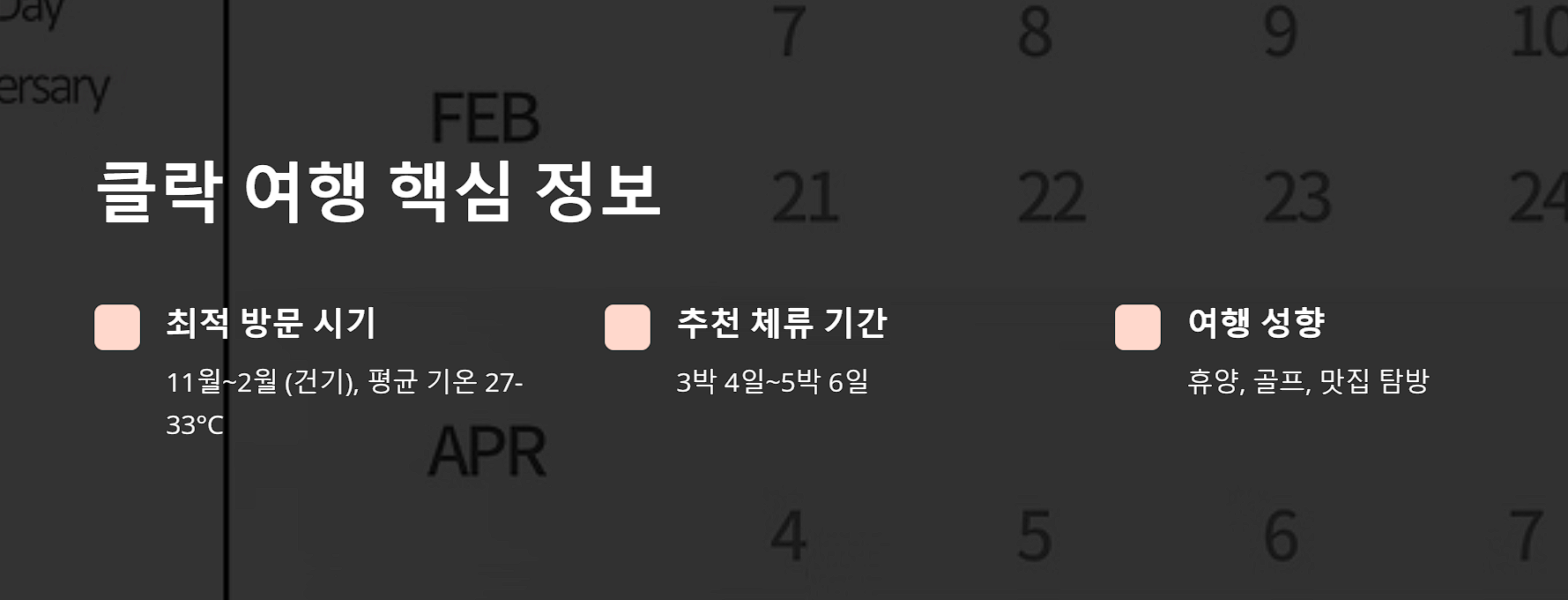 | 건기(11-4월) | 쾌적한 날씨, 최적의 여행시기 | 골프, 액티비티 |
