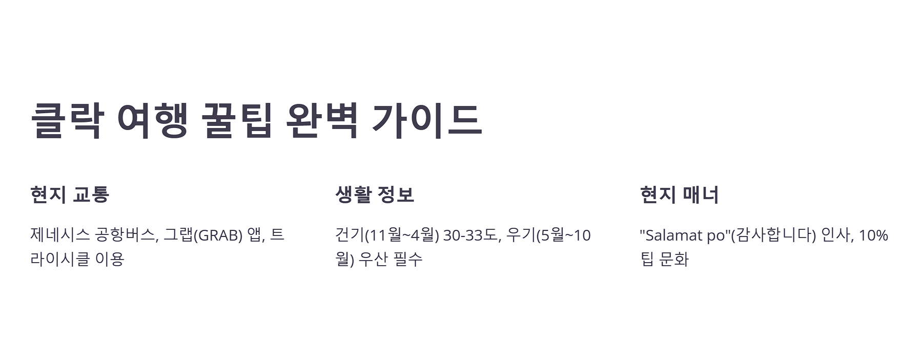 | 우기(5-10월) | 간헐적 스콜, 실내활동 추천 | 쇼핑, 스파 |