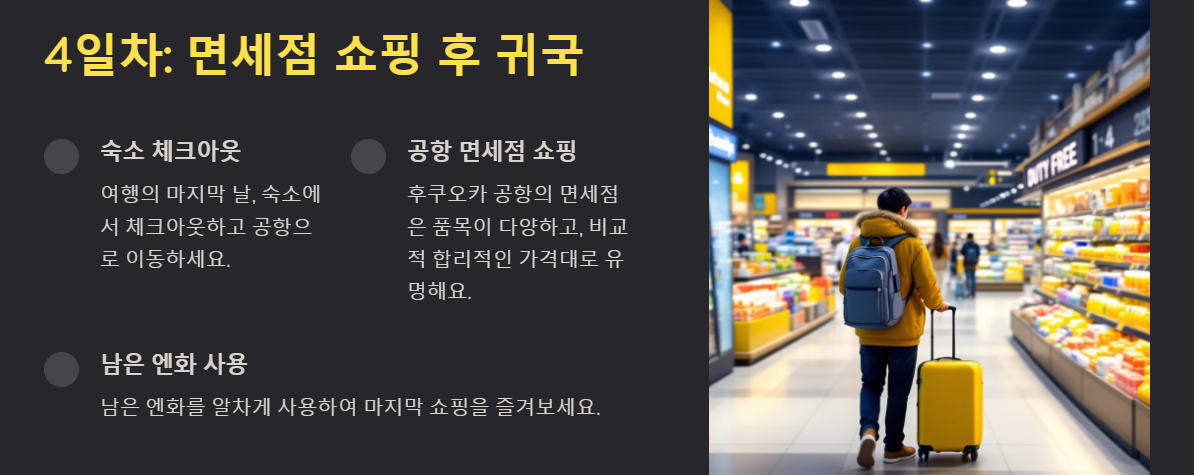 마지막 날에는 숙소 체크아웃 후 공항으로 이동해 남은 엔화를 면세점에서 알차게 사용하는 것도 좋은 방법이에요. 후쿠오카 공항의 면세점은 품목이 다양하고, 비교적 합리적인 가격대로 유명하답니다.