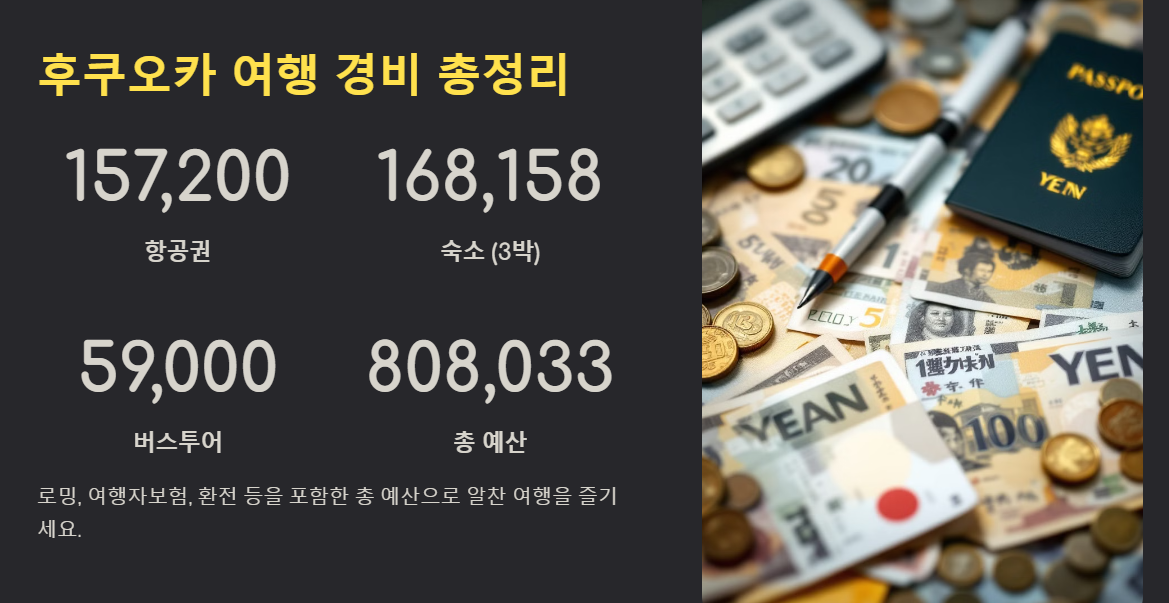 후쿠오카는 합리적인 예산으로도 충분히 즐길 수 있는 여행지예요. 아래 표를 참고해 주요 경비를 확인해 보세요.