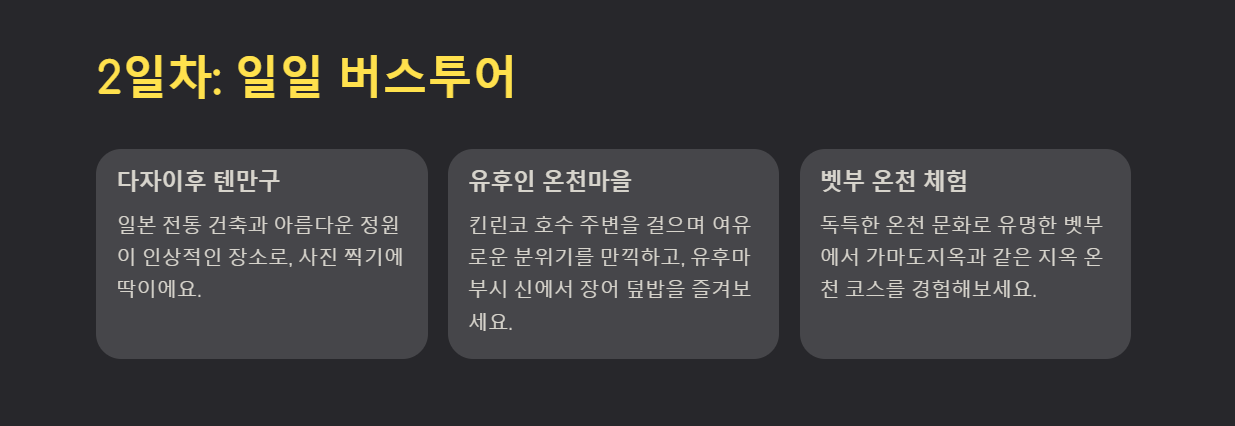 2일차는 버스투어를 추천드려요. 다자이후 텐만구는 일본 전통 건축과 아름다운 정원이 인상적인 장소로, 사진 찍기에 딱이에요.
